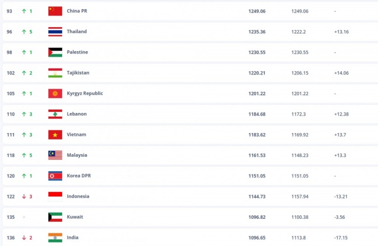 FIFA亚洲排名:国足仍位列亚洲第14,日伊韩前三